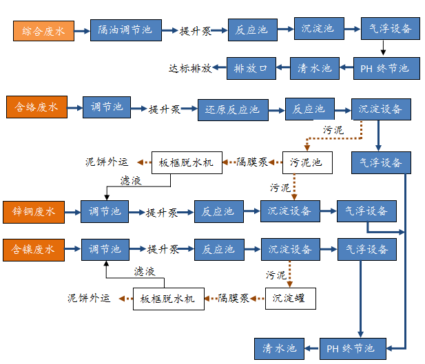 電鍍廢水屬于重金屬廢水,主要指電鍍生產(chǎn)工藝過程中排出的鍍前處理廢水、鍍層漂洗廢水、鍍層后處理廢水以及電鍍廢液等。電鍍廢水包括電鍍生產(chǎn)工藝過程中產(chǎn)生的含Cr6+、Ni2+、Zn2+、Cu2+、Cd2+等單一或混合廢水。